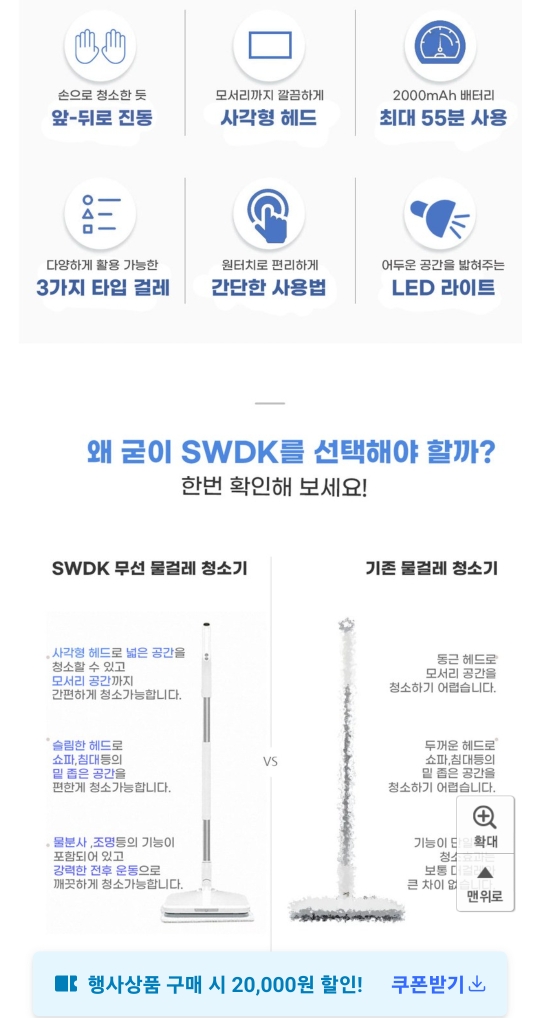 기간 한정이지만, 최종가격이 40,000원으로 가성비가 좋은 무선 물걸레 청소기입니다.